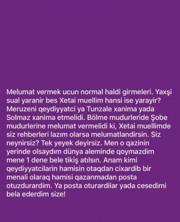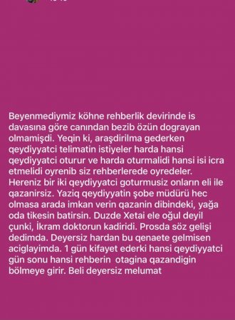 Bu da kecmiş işcin İlahə xanımın vatcapp qrupunda paylaşımları! Başın acılanda bunlara da bir nəzər yetirərsən, cənab direktor!!!